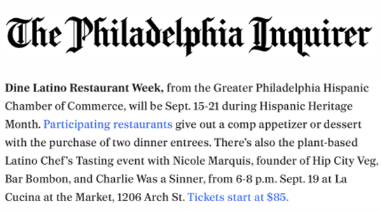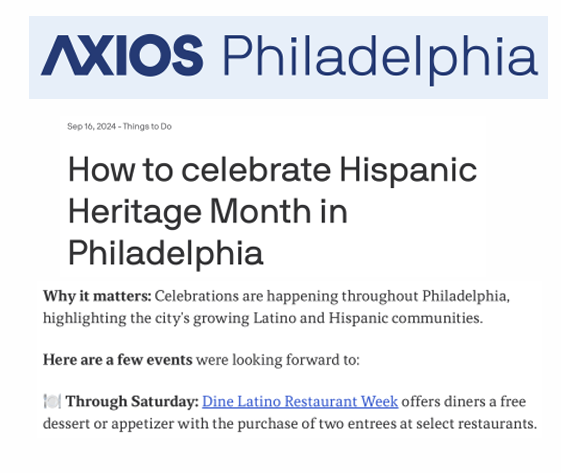 In September 2024, Cashman & Associates was tapped by the Greater Philadelphia Hispanic Chamber of Commerce to design and execute a media and influencer campaign to generate buzz and awareness surrounding the biannual Dine Latino Restaurant Week of Fall 2024. The campaign highlighted the participating Hispanic owned-and-operated restaurants as well as the greater mission of the program brought to life by the Greater Philadelphia Hispanic Chamber of Commerce.